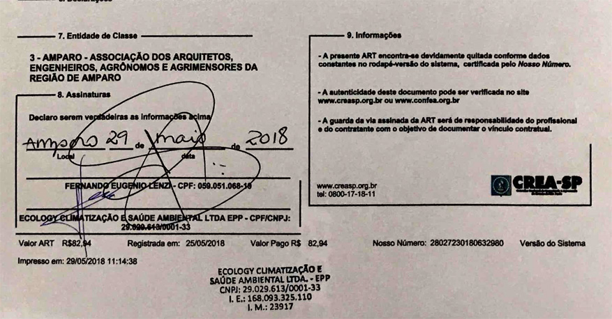 A Ecology possui um engenheiro responsável que acompanha todos os laudos elaborados pelos técnicos da empresa, e também emite a ART - Anotação de Responsabilidade Técnica. Além disso, elabora o plano de manutenção de acordo com a realidade de cada cliente, com os pontos de melhorias e alterações, sempre que iniciar um contrato