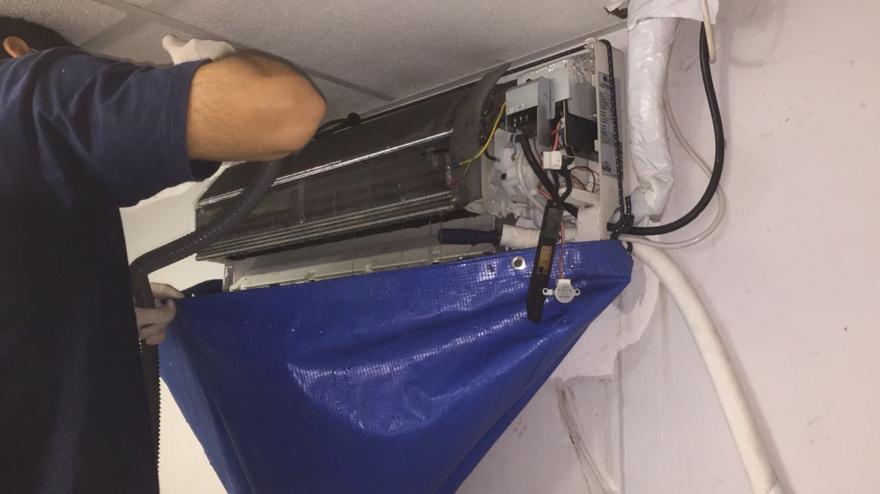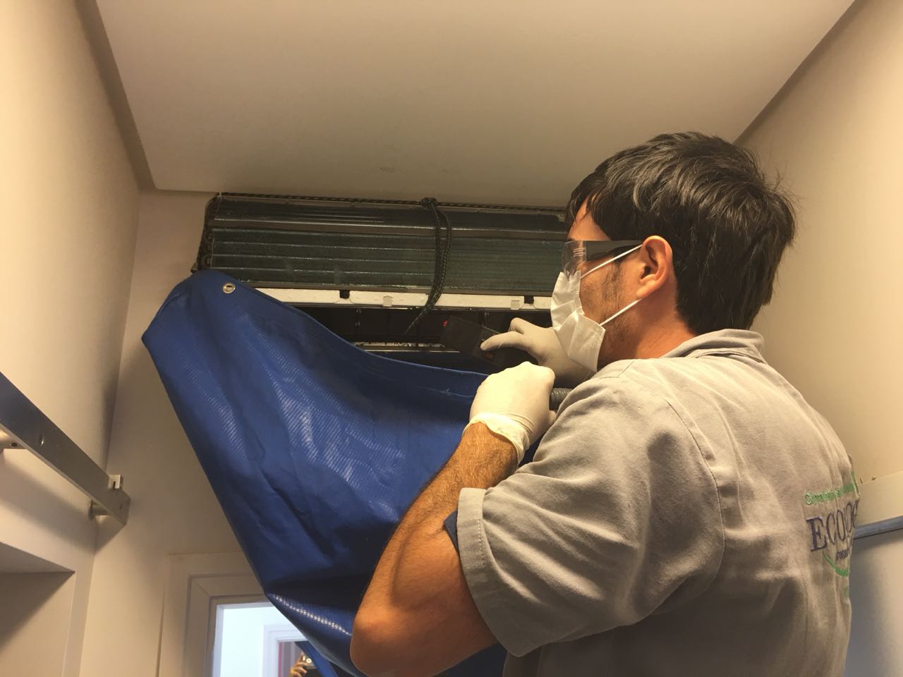 Processo moderno com equipamento multifuncional e bolsas coletoras, lavando, higienizando e sanitizando o ar condicionado no local em que ele está instalado, ganhando tempo e permitindo ao cliente acompanhar nosso trabalho e verificar o estado de sujidade e contaminação em que a máquina se encontra.